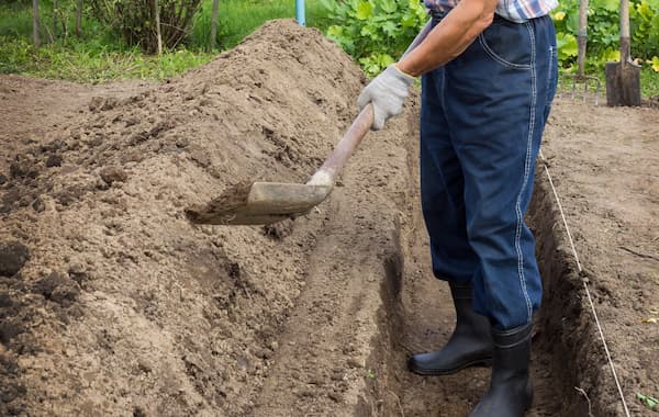 - Kaiva oja, jonka minimileveys ja syvyys on 50 cm. Mielellään se saa olla suurempikin, erityisesti, jos istutat valmiiksi isoja taimia. Tärkeää on, että maata muokataan juuripaakun alta ja sivuilta, jotta juuret pääsevät uuteen kasvuun.
