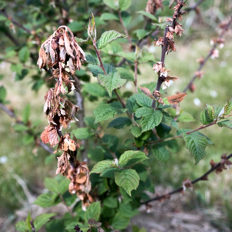 Sieni säilyy sairaissa kasvinosissa, joten ne ja ainakin 10 cm tervettä oksaa poistetaan pikimmiten ja hävitetään sekajätteessä.